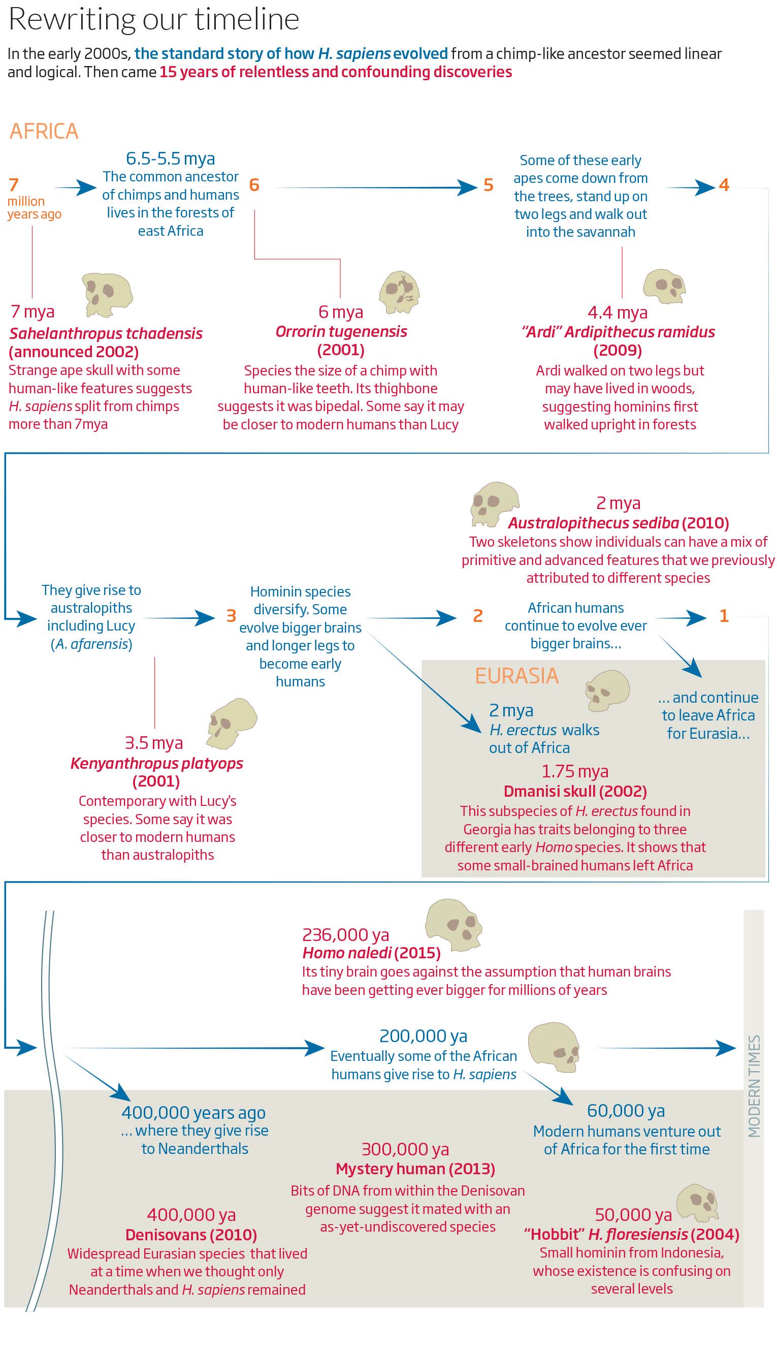 Once upon a time, the human story seemed relatively straightforward (see blue text in timeline, below). It began roughly 5.5 to 6.5 million years ago, somewhere in an east African forest, with a chimpanzee-like ape. Some of its descendants would eventually evolve into modern chimps and bonobos. Others left the forest for the savannah. They learned to walk on two legs and, in doing so, launched our own hominin lineage.