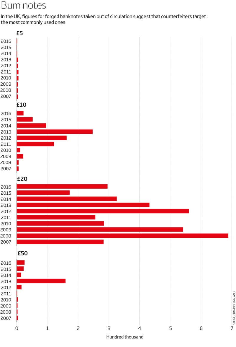It’s obvious why you’d want to forge a banknote, but how much of a problem are they? Our best indication is the number of fake banknotes removed from circulation each year, though the real number of fakes is probably higher. The Bank of England removed 347,000 banknotes in 2016, about 0.1 per cent of the number out there. The figure for US dollars is lower: about 0.005 per cent of the currency in circulation is fake. The US Secret Service seized $30 million worth at the end of last year.